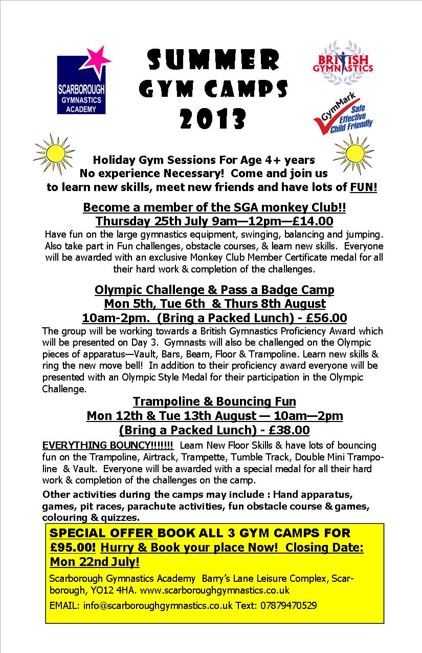 Image July 17, 2013 by evywalker SGA Summer Gymnastics Camps! Closing Date Mon 22nd July! Share this: Click to share on X (Opens in new window) X Click to share on Facebook (Opens in new window) Facebook Click to share on Tumblr (Opens in new window) Tumblr Like Loading...