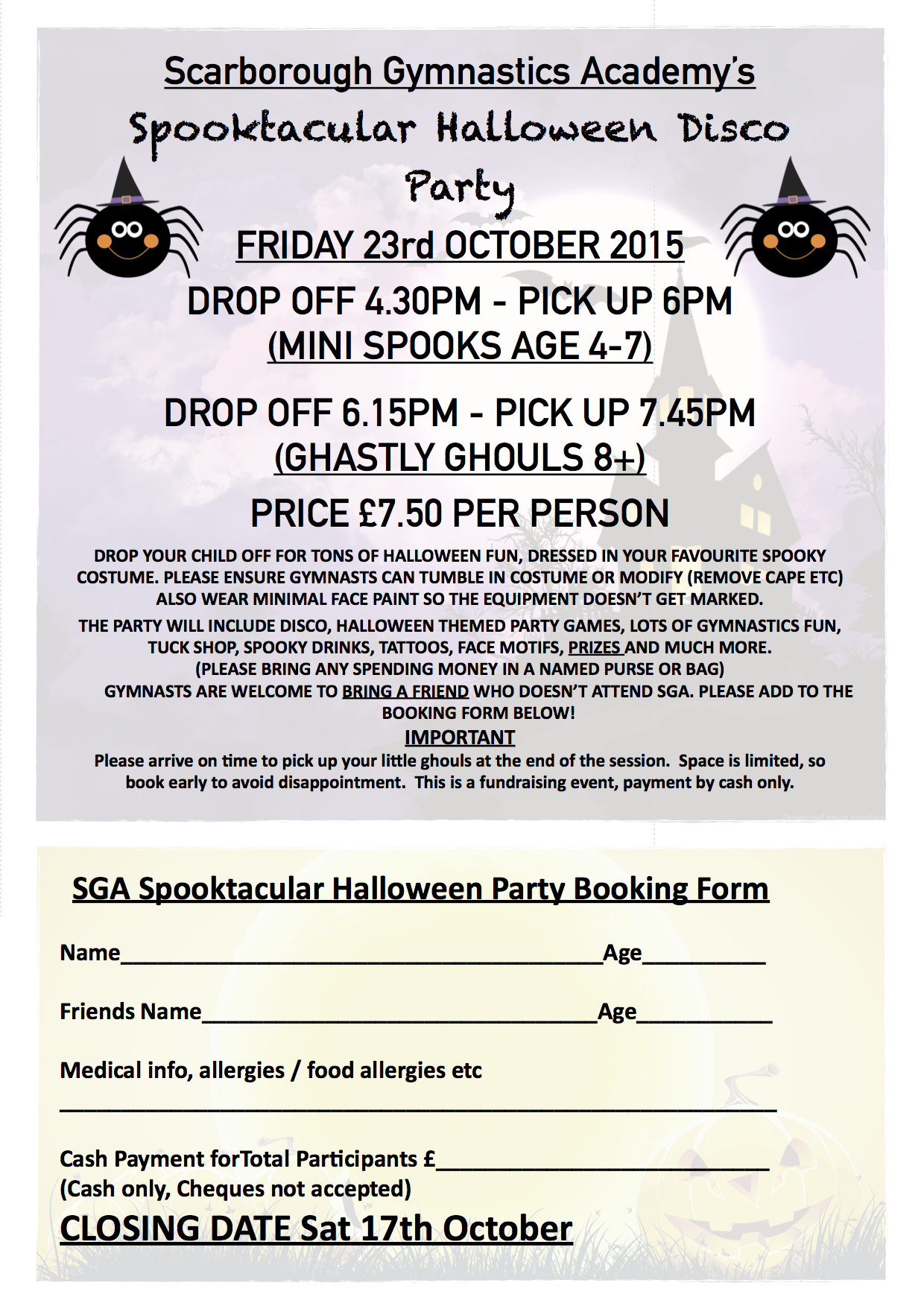 October 12, 2015 by evywalker SGA HALLOWEEN PARTY – Booking Open Now! SGA Halloween Party – Click Here to download booking form! Share this: Share on X (Opens in new window) X Share on Facebook (Opens in new window) Facebook Share on Tumblr (Opens in new window) Tumblr Like Loading...