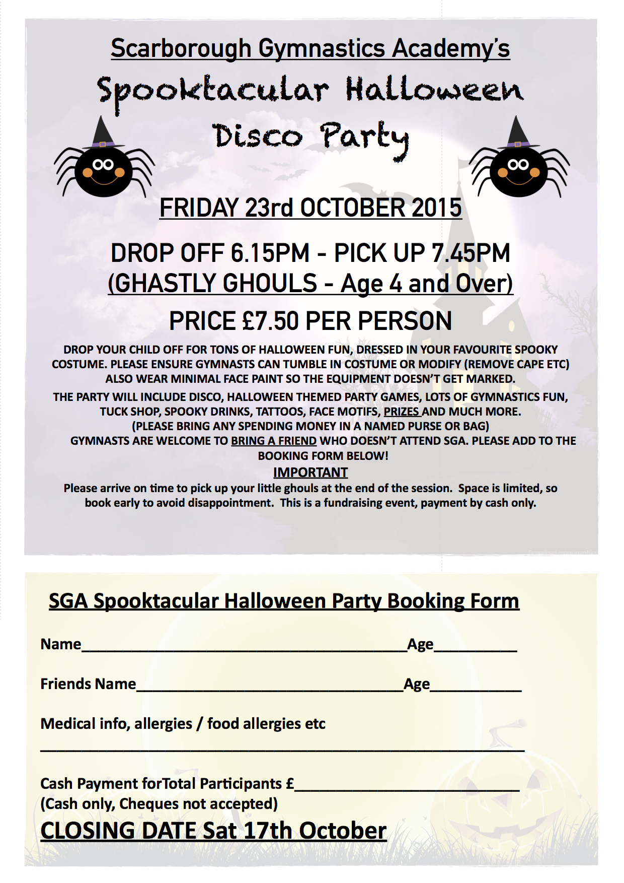 THE PARTY WILL INCLUDE DISCO, HALLOWEEN THEMED PARTY GAMES, LOTS OF GYMNASTICS FUN, TUCK SHOP, SPOOKY DRINKS, TATTOOS, FACE MOTIFS, PRIZES AND MUCH MORE.